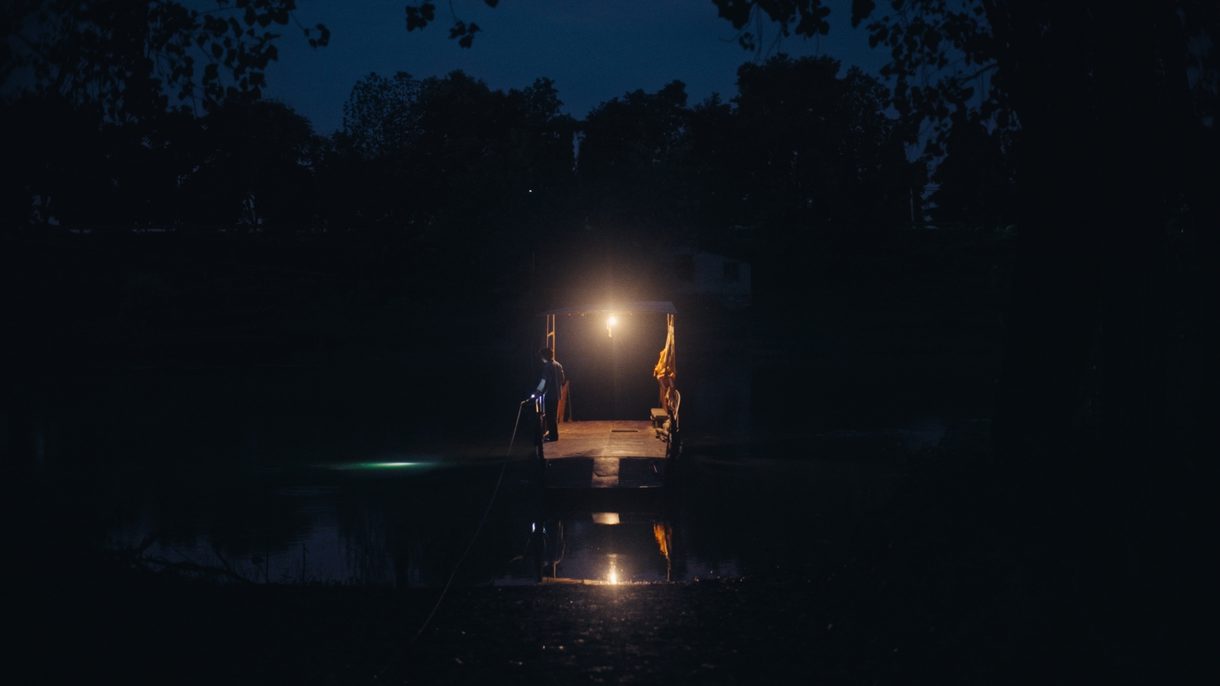 A young man cannot sleep. He ventures into the forest guided by the trace of a sound. A truck moves through the darkness of the night; it stops, unfolding into a stage in the woods, its red curtains billowing in the wind. The young man follows the sound across the river, across the woods, past the shadows of the trees. His torchlight lands upon the stage where an older woman starts her performance. Fireworks explode above the stage like drumbeats. Morning slowly dawns upon the silent woods of Nanxian, Southern China.