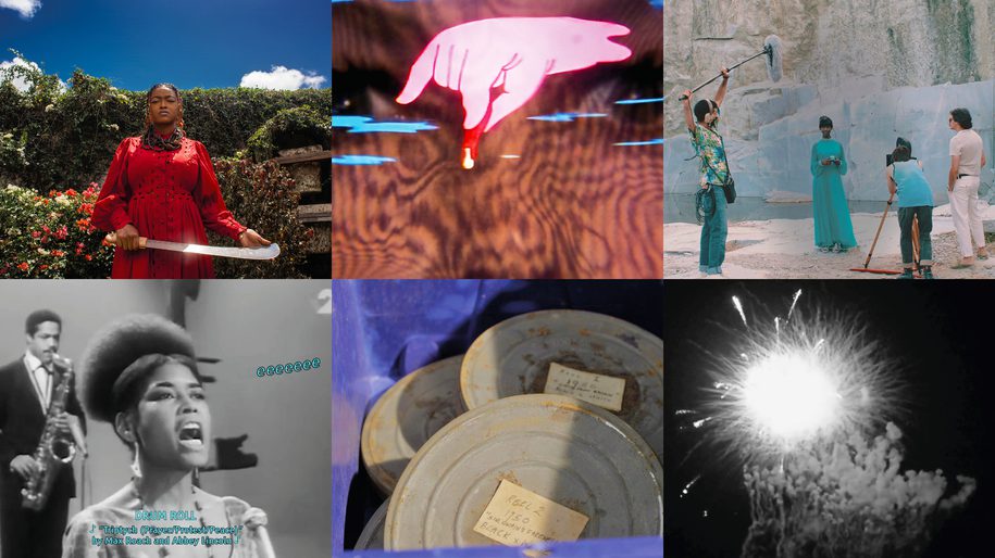 Composite of stills from work in the Jarman Award 2022 touring programme: (top left to bottom right) Alberta Whittle, Jamie Crewe, Grace Ndiritu, Rosa-Johan Uddoh, Onyeka Igwe and Morgan Quaintance
