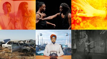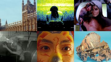 Composite of stills by the Film London Jarman Award 2024 shortlist (from top left to bottom right): Rosalind Nashashibi, The Invisible Worm (2024); Larry Achiampong, A Letter (Side B) (2023); Maryam Tafakory, Nazarbazi (2022); Melanie Manchot, Liquid Skin (2023); Sin Wai Kin, Dreaming the End (2022); Maeve Brennan, An Excavation (2022)