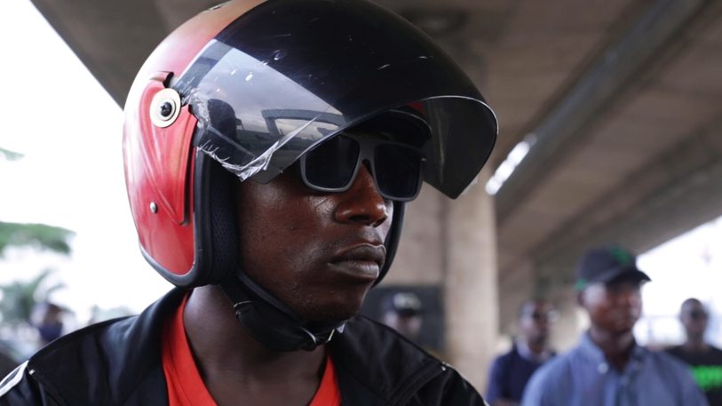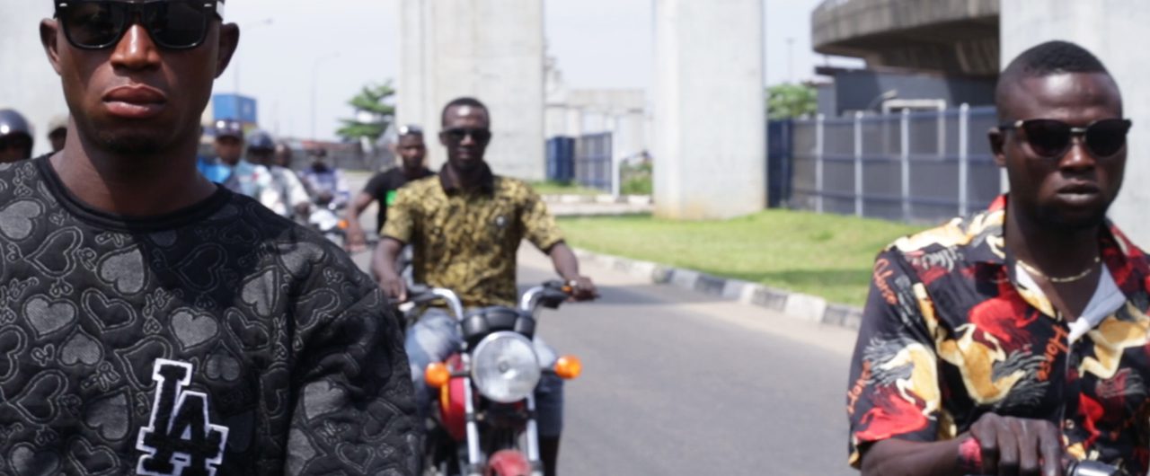 Machine Boys explores the precarity of the okada trade in the wake of the 2022 ruling to outlaw commercial motorcycles in Lagos — the latest in many unsuccessful attempts. Authorities have long blamed okadas for the city’s staggering rate of road accidents, even as official statistics indicate that cars and danfos (commercial minibuses) induce many more. The film extends Ashadu’s longstanding engagement with (post)colonial visions of modernity, at the expense of popular livelihoods and local ways of getting by. Okadas first appeared in Edo State, as unemployed university students took up motorcycle taxis in the wake of the devastating IMF-imposed structural adjustment programs in the late 1980s. The riders borrow their name from the defunct Nigerian airline Okada Air, channelling its reputation for speed and efficiency. In a megalopolis of over 20 million inhabitants, with intractable gridlocks and infrastructural challenges, okadas have become a vital means of navigating an urban landscape of narrow, congested and pothole-riddled roads for a majority of low- and middle-income earners.