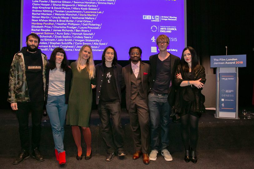 Jarman Award 2018 shortlisted artists. Left to right: Hardeep Pandhal, Margaret Salmon, Daria Martin, Lawrence Lek, Larry Achiampong, David Blandy, Jasmina Cibic. Photo by Freezeframe Media