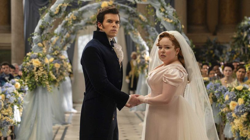 Nicola Coughlin as Penelope Bridgerton and Luke Newton as Colin Bridgerton in the ORNC chapel