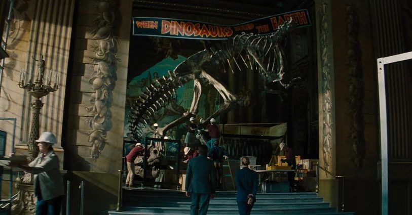 ‘For this, our world-famous Painted Hall was transformed into the fictional ‘Natural History Museum of North America.’ The production team created a remarkably convincing display, complete with fossil replicas and labelled crates, all staged as if the collection was being packed away due to waning public interest in dinosaurs. It was fascinating to see the Hall reimagined as a modern American institution. This sequence was even chosen as the opening for the film’s first trailer, featuring the dramatic disassembly of a T. rex skeleton and a banner draped across the hall in a visual homage to the original Jurassic Park.’