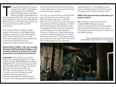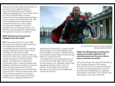 LF: ‘There were plenty of memorable moments, but one that really stood out was seeing the Painted Hall completely transformed with towering dinosaur skeletons and museum-style installations. As someone who remembers watching Jurassic Park as a child on an early trip to the cinema, it felt surreal to be part of the franchise’s legacy. The attention to detail was remarkable. Every crate and display was labelled, and the set included in-universe histories about the creation of the dinosaurs and references to events from previous films. The production even used CGI to replace some of our baroque imagery on the Hall’s walls and ceiling with dinosaurs, blending the historic setting with the world of Jurassic World. Even though much of this detail might not be visible on screen, it added a sense of authenticity that really comes through when you watch the film.