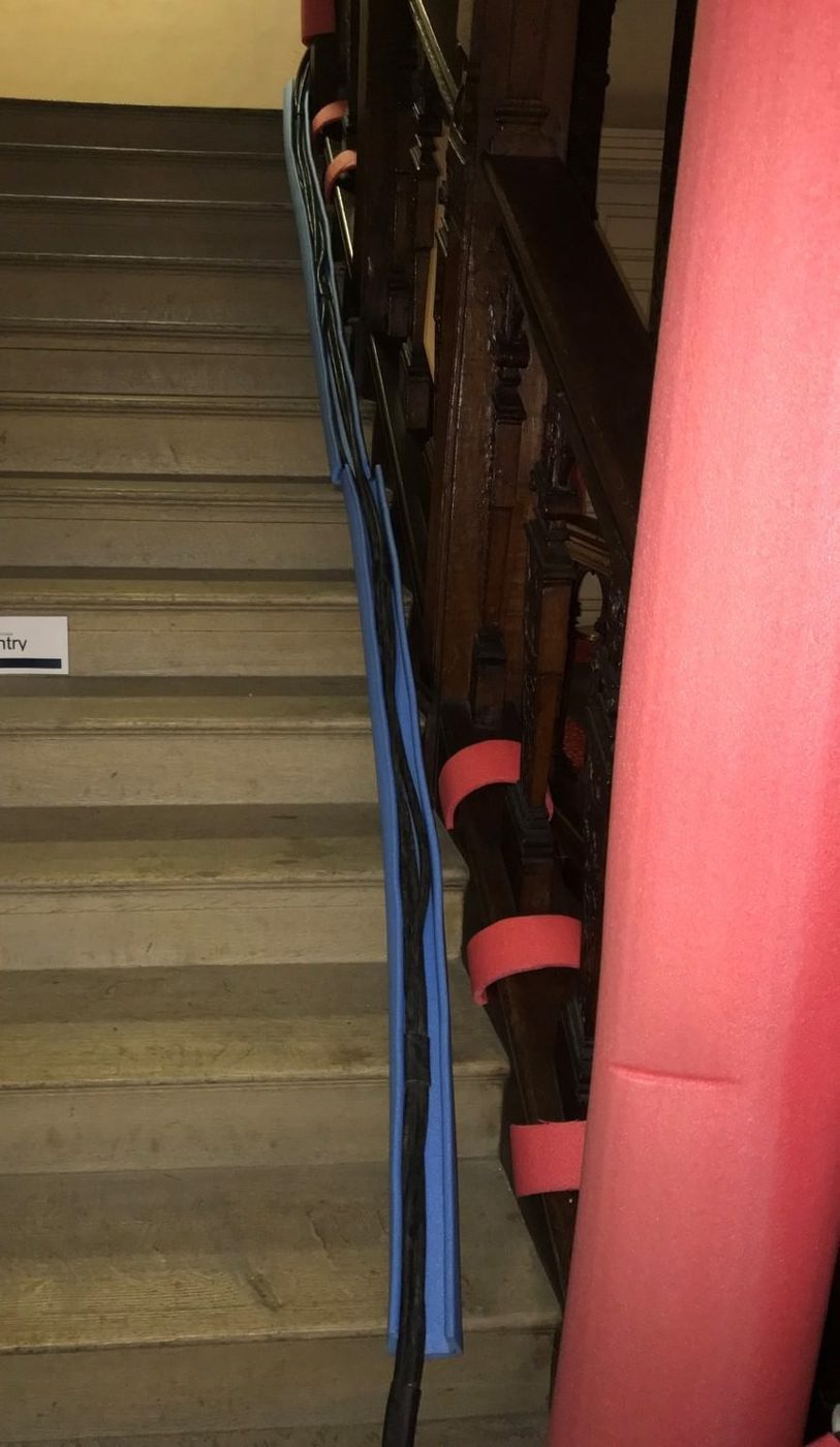 1. Upside down foam stair handrail protectors are useful for putting cables in so they don’t mark floors or walls.