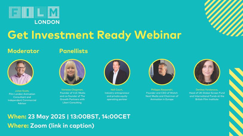 Film London’s recent Get Investment Ready webinar brought together leading voices in animation finance and growth strategy to offer practical guidance on preparing for investment. Moderated by Film London Animation Consultant Julian Scott, the panel featured Vanessa Chapman (co-founder of The Growth Partners and Founder, VJC Media), Neil Court (Industry Entrepreneur and Private Equity Operating Partner), Denitsa Yordanova (Head of the UK Global Screen Funds, BFI), and Philippe Alessandri (CEO, Watch Next Media).