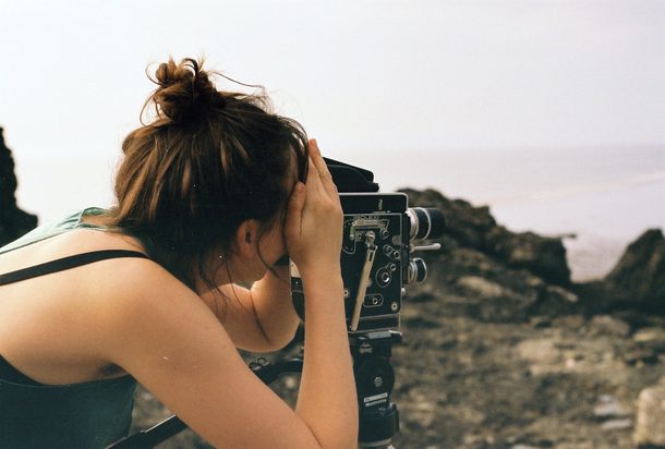 Julia Parks portrait with Bolex camera. Photo by Jameela Khan