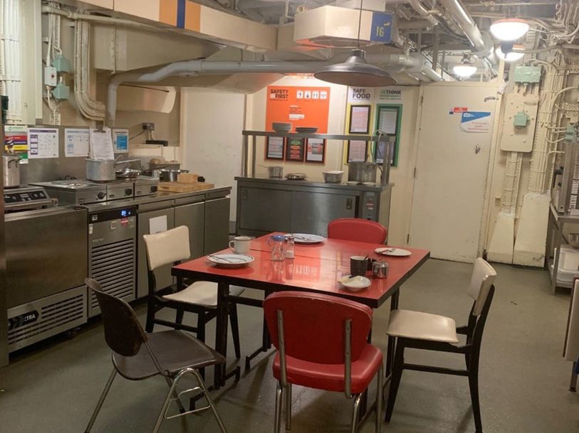 Jennifer: “They had a full day load-in followed by a one-day shoot back in May 2019. HMS Belfast was doubling as a container ship for a number of different sequences. The production used the external boat deck, and had actors dressed in combat gear, with really large guns placed all over the super-structure of the ship. They also used one of our galleys (kitchens) to shoot a more intimate scene with actors seated around a table smoking and eating. The main interior 2-Deck corridor was also used for some very exciting chase scenes, which should be particularly atmospheric as they were shot using only torch light.”