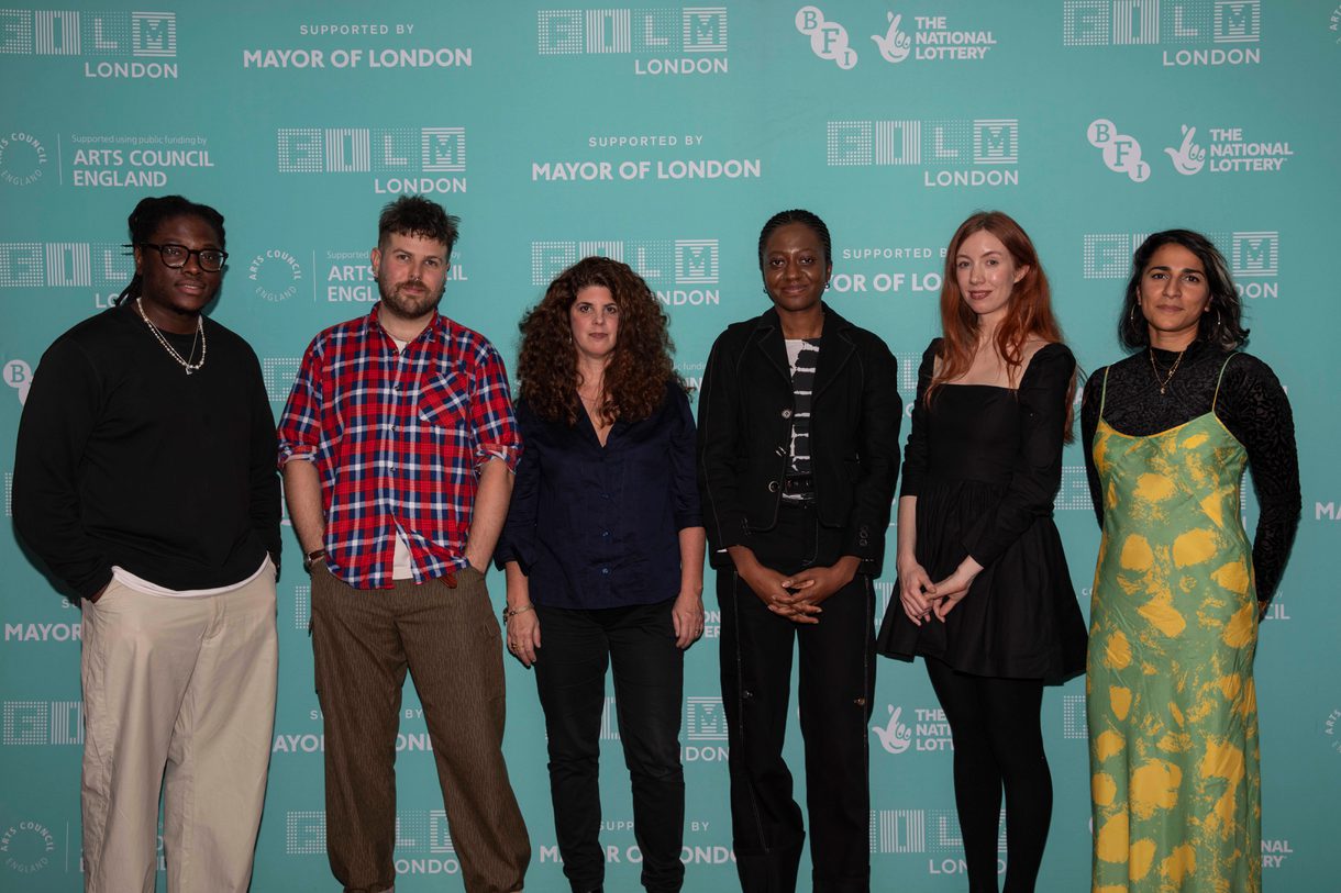 Artists shortlisted for the Film London Jarman Award 2023. From left to right: Julianknxx, Andrew Black, Karen Russo, Ayo Akingbade, Sophie Koko Gate, Rehana Zaman. Photo by Ro Murphy