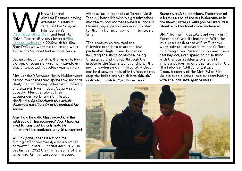 AH: “Supacell spent a lot of time filming at Thamesmead, over a number of months in late 2022 and early 2023. In September 2022 they filmed some of the series most important opening scenes with us. Including shots of Tazer’s (Josh Tedeku) home life with his grandmother, and the pivotal moment where Michael’s (Tosin Cole) superpowers are activated for the first time, allowing him to rewind time.