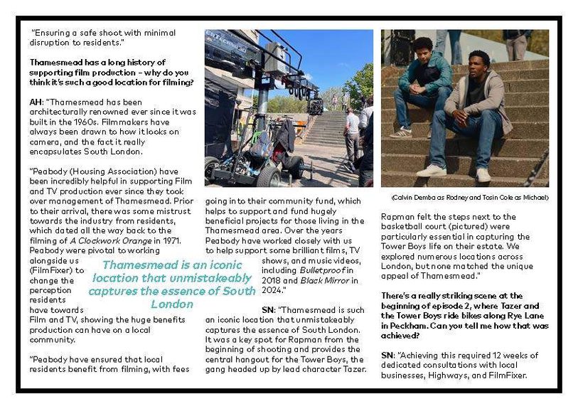 “Peabody have ensured that local residents benefit from filming, with fees going into their community fund, which helps to support and fund hugely beneficial projects for those living in the Thamesmead area. Over the years Peabody have worked closely with us to help support some brilliant films, TV shows, and music videos, including Bulletproof in 2018 and Black Mirror in 2024.”