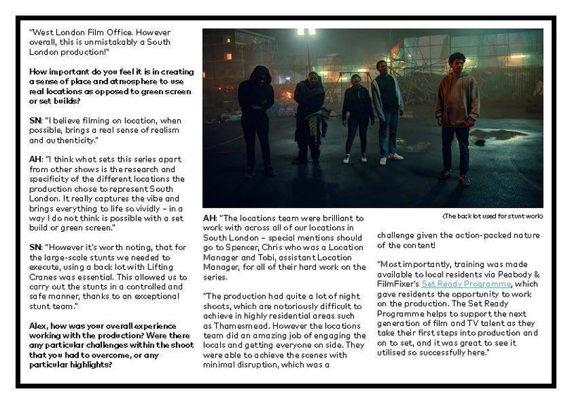 AH: “The locations team were brilliant to work with across all of our locations in South London – special mentions should go to Spencer, Chris who was a Location Manager and Tobi, assistant Location Manager, for all of their hard work on the series.