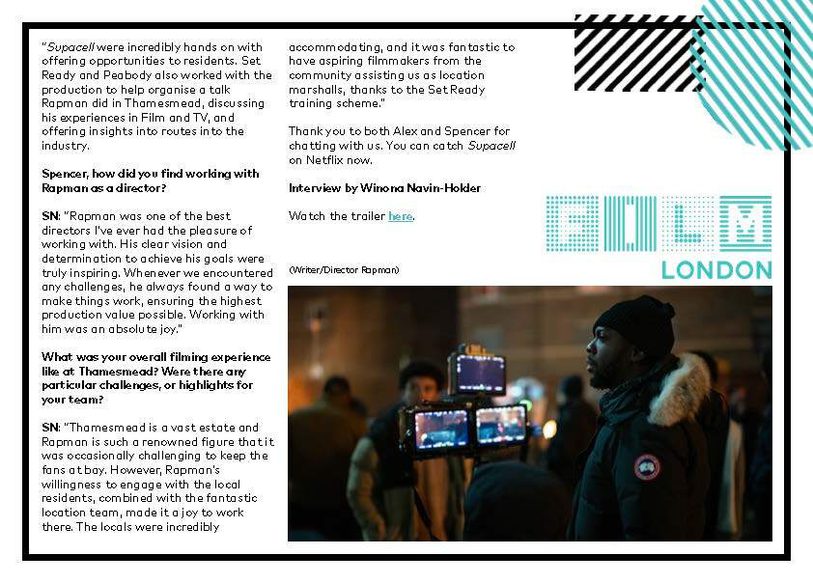 “Supacell were incredibly hands on with offering opportunities to residents. Set Ready and Peabody also worked with the production to help organise a talk Rapman did in Thamesmead, discussing his experiences in Film and TV, and offering insights into routes into the industry.