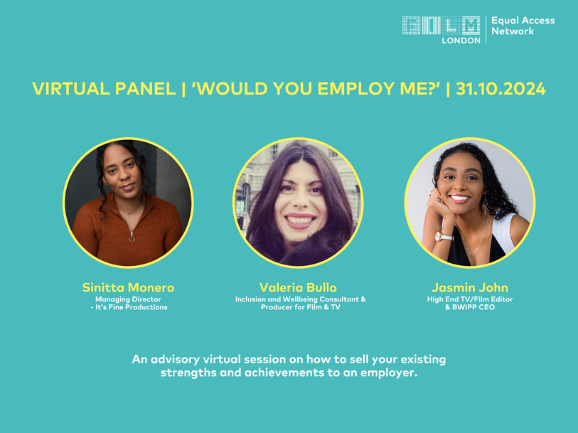 We were delighted to be joined by 3 women in senior positions, spanning, pre-production, production and inclusion & wellbeing in the industry, and post-production, as part of a virtual panel discussion led by Film London’s Skills Team.