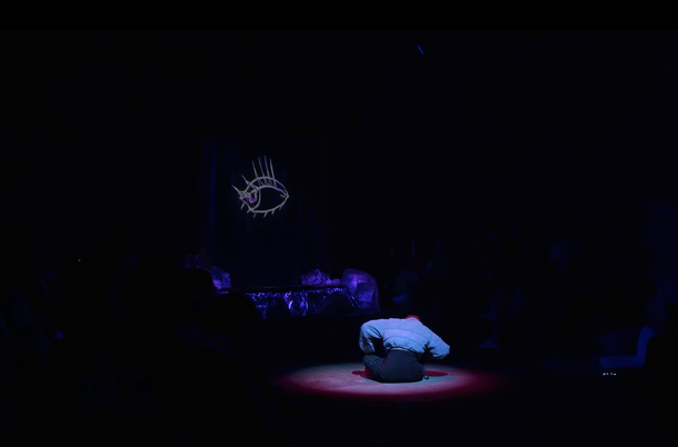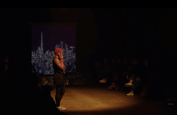 Tatenda Naomi Matsvai, Dark Matter, Vault Festival, London (February 2023), performance documentation. Animation design by Gisela Mulindwa.