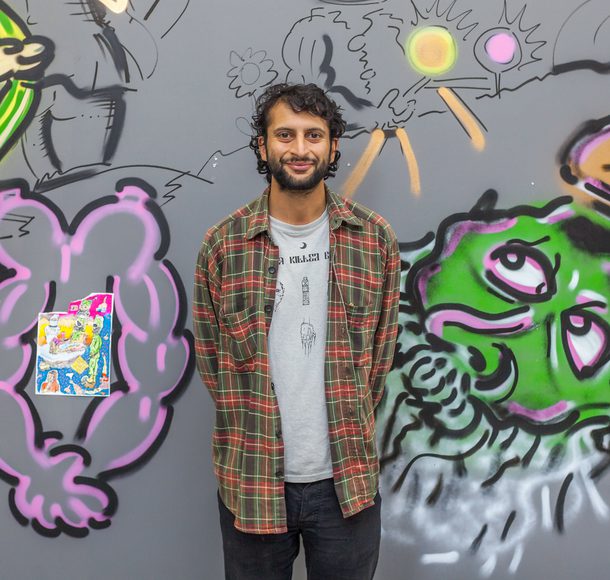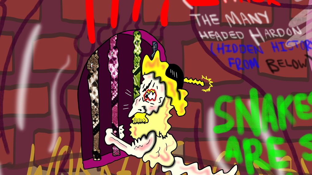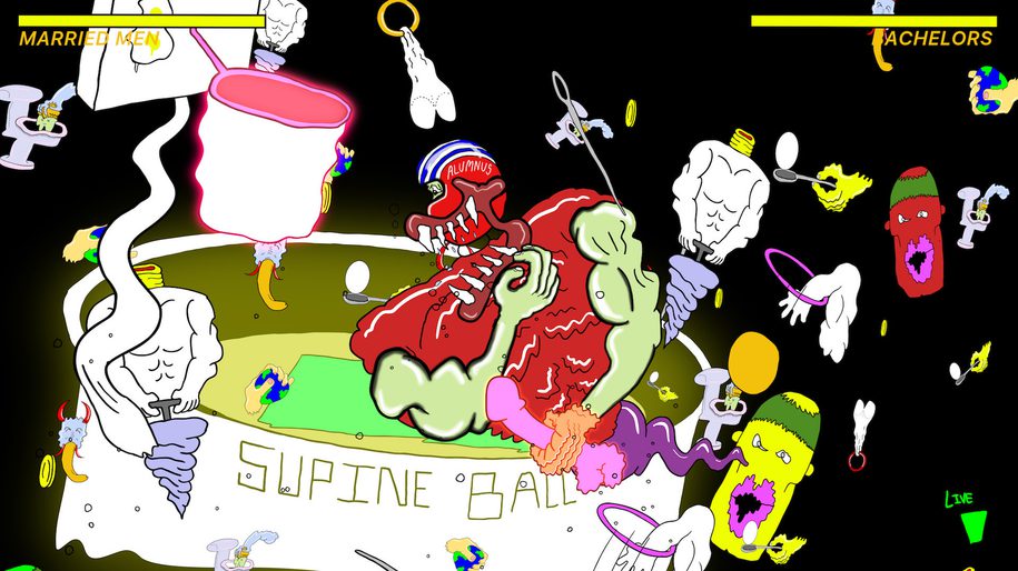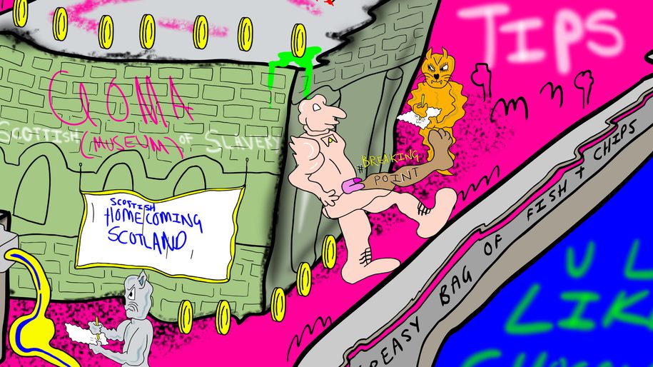 Hardeep Pandhal lives and works in Glasgow. Pandhal works with non-linear forms of digital video which layer lurid hand drawn cartoons, psychedelic and disorienting narratives with his own rap music, presenting them within wider installations and wall drawings. For the Jarman Award, Pandhal presented from a body of work that reroutes the misogynist and racist imagination underpinning white supremacy into cartoon phantasms that haunt contemporary life. The frustrations of societal structures are projected into satirical cartoon worlds, where viewers are presented with seemingly infinite perspectives of recurring yet disjointed scenes.