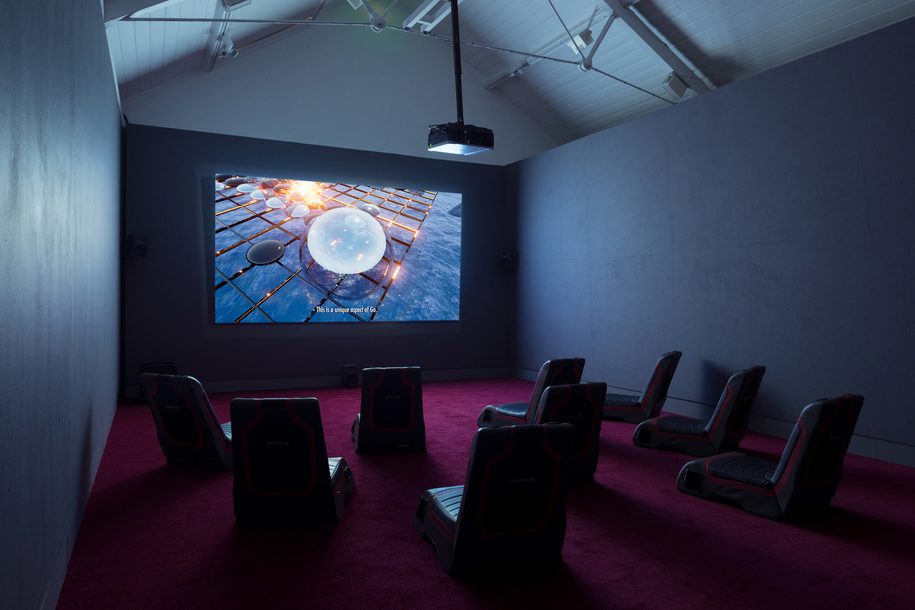 Lawrence Lek, Geomancer (2017), installation view at Jerwood Space, London. Photo by Anna Arca. Commissioned through the Jerwood/FVU Awards 2017. Courtesy of the artist and Sadie Coles HQ, London